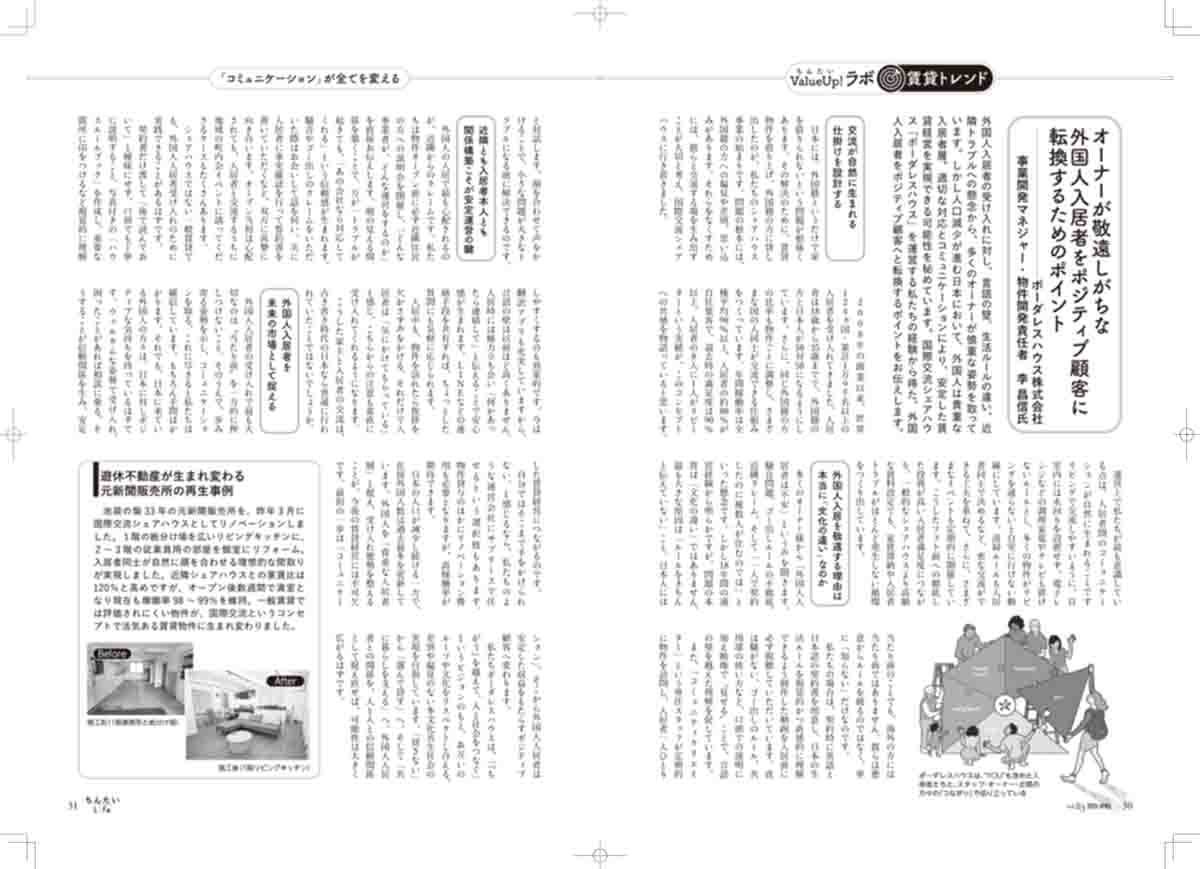 「賃貸トレンド」のコーナーにて、「オーナーが敬遠しがちな外国人入居者をポジテ ィブ顧客に転換するためのポイント」をテーマに、見開き2ページにわたる特集記事として掲載いただいております。
